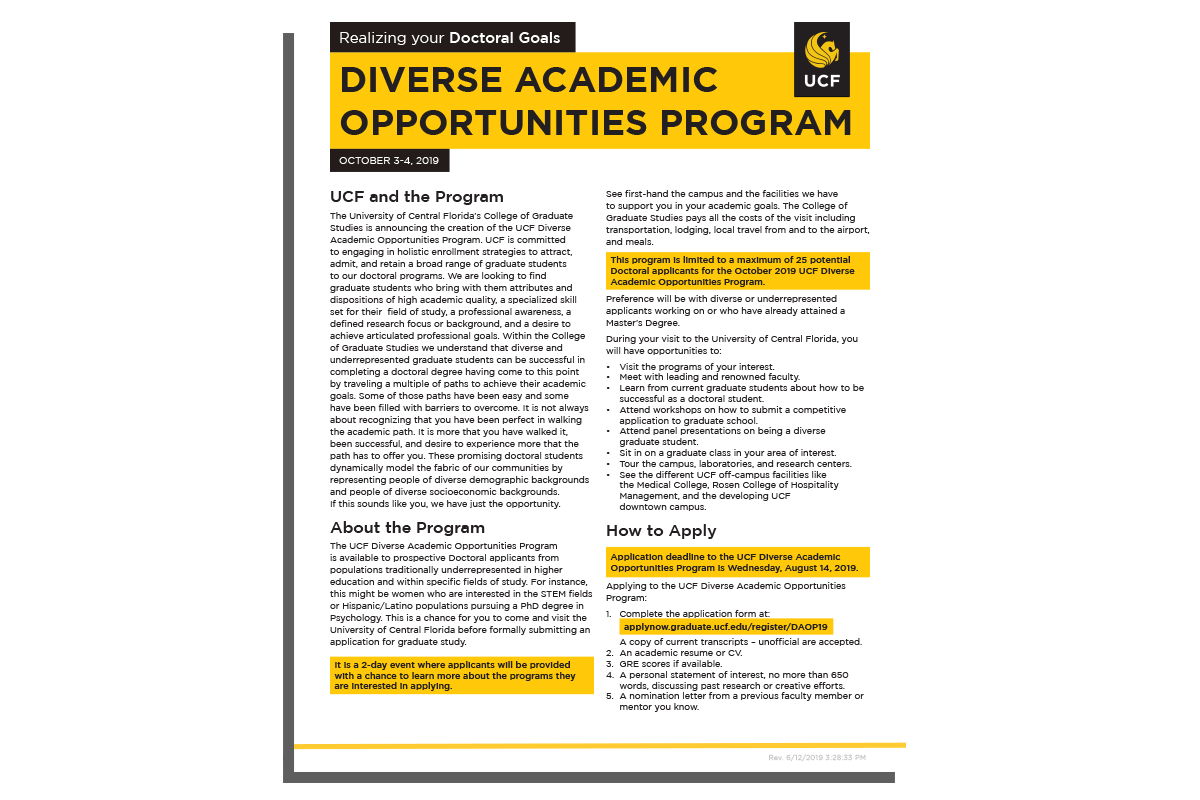 The UCF Diverse Academic Opportunities Program is a two-day event for prospective doctoral applicants from underrepresented populations in higher education to learn more about the programs they’re interested in before applying to graduate study at UCF.