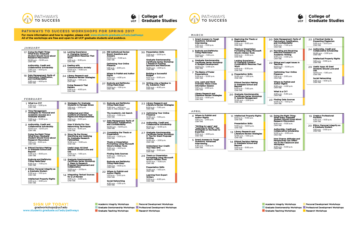 Coordinated by the College of Graduate Studies, the Pathways to Success program offers the following free development opportunities for graduate students and postdoctoral scholars including workshops in Academic Integrity, Graduate Grantsmanship, Graduate Teaching, Personal Development, Professional Development, and Research.