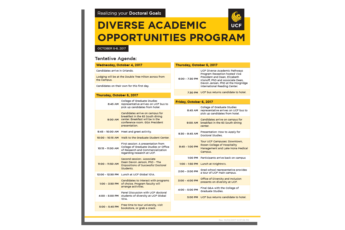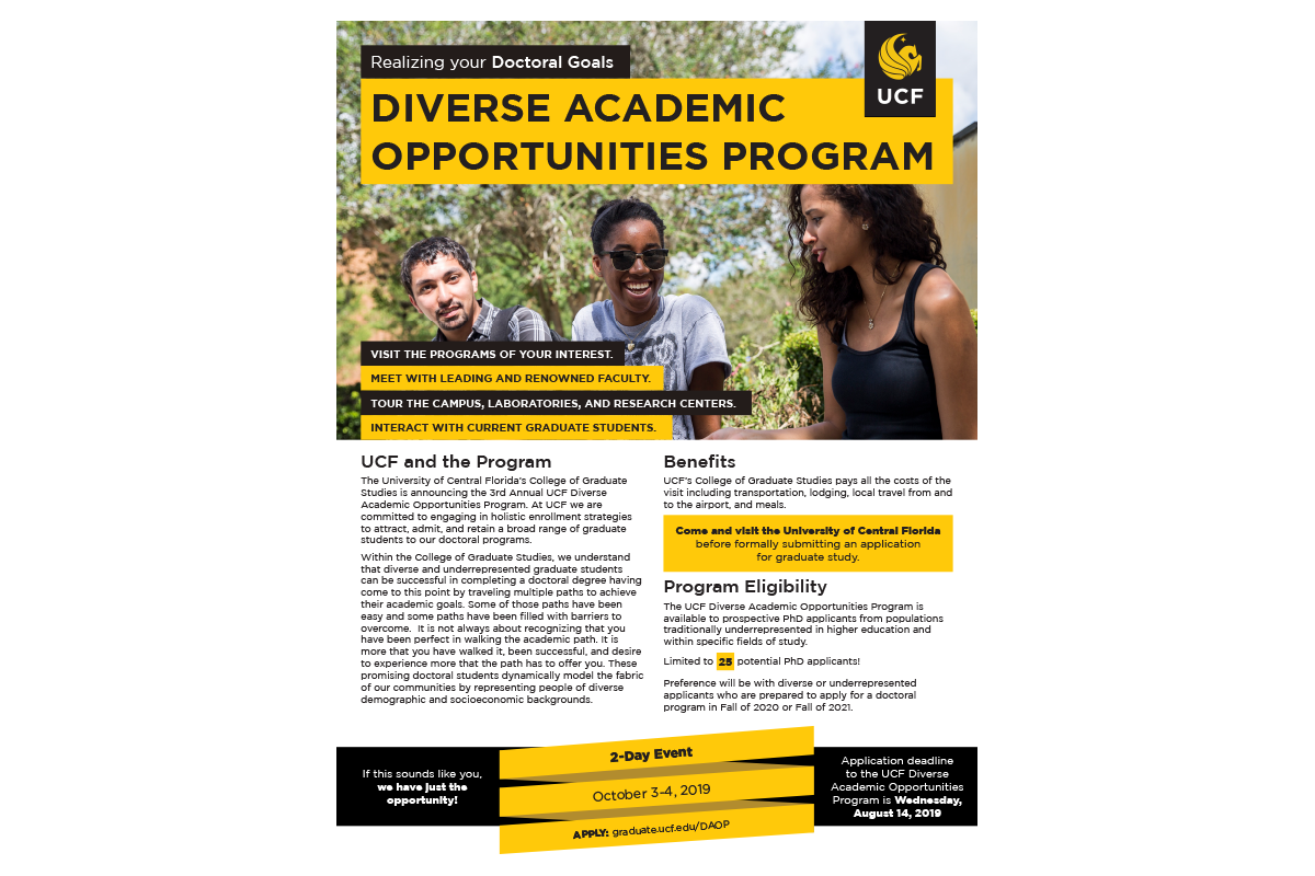 The UCF Diverse Academic Opportunities Program is a two-day event for prospective doctoral applicants from underrepresented populations in higher education to learn more about the programs they’re interested in before applying to graduate study at UCF.
