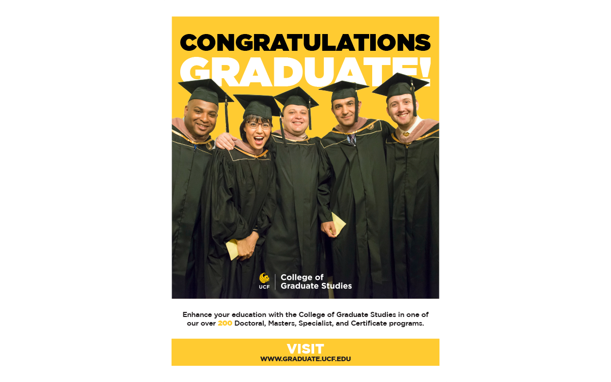This design is printed and mailed with every diploma for undergraduates at the University of Central Florida. The mailer is used to recruit undergraduate students into continuing their education further with the College of Graduate Studies.